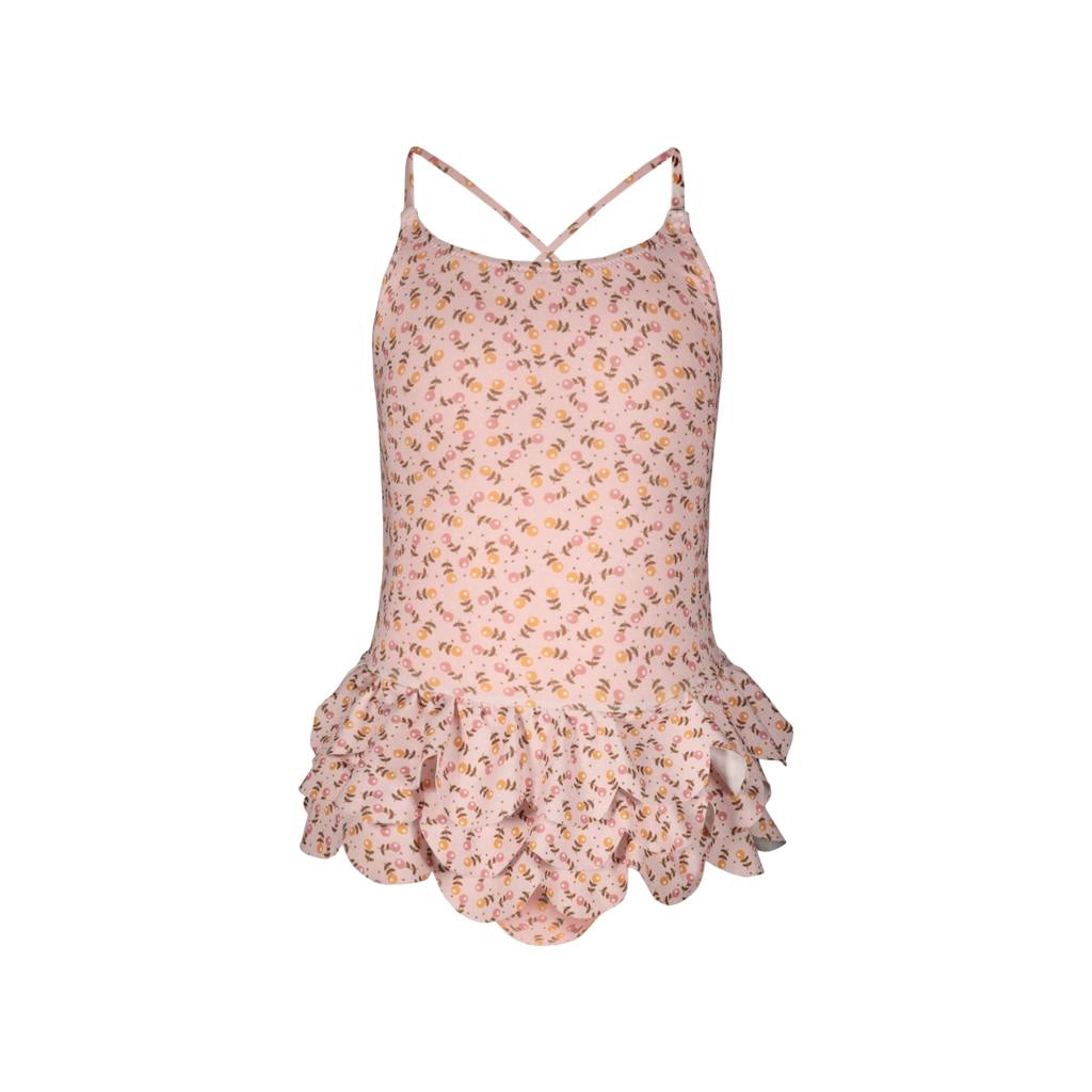 Costume intero Gilda fiori pallotti in microfibra con tripla balza di petali. Lacci regolabili. Internamente foderato. Articolo abbinato con la donna nel modello monospalla.