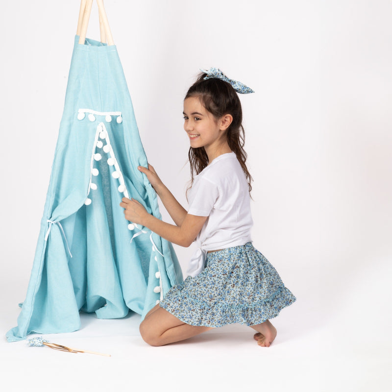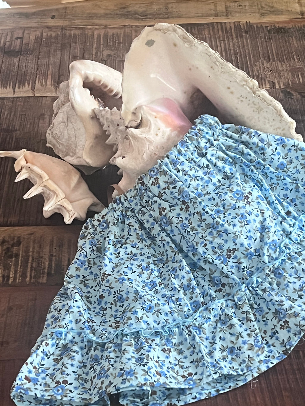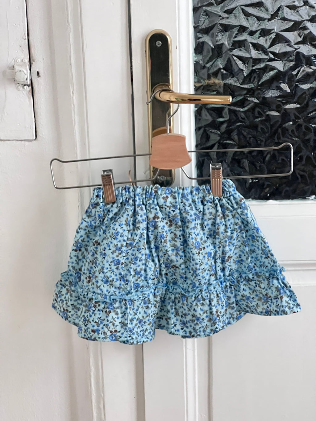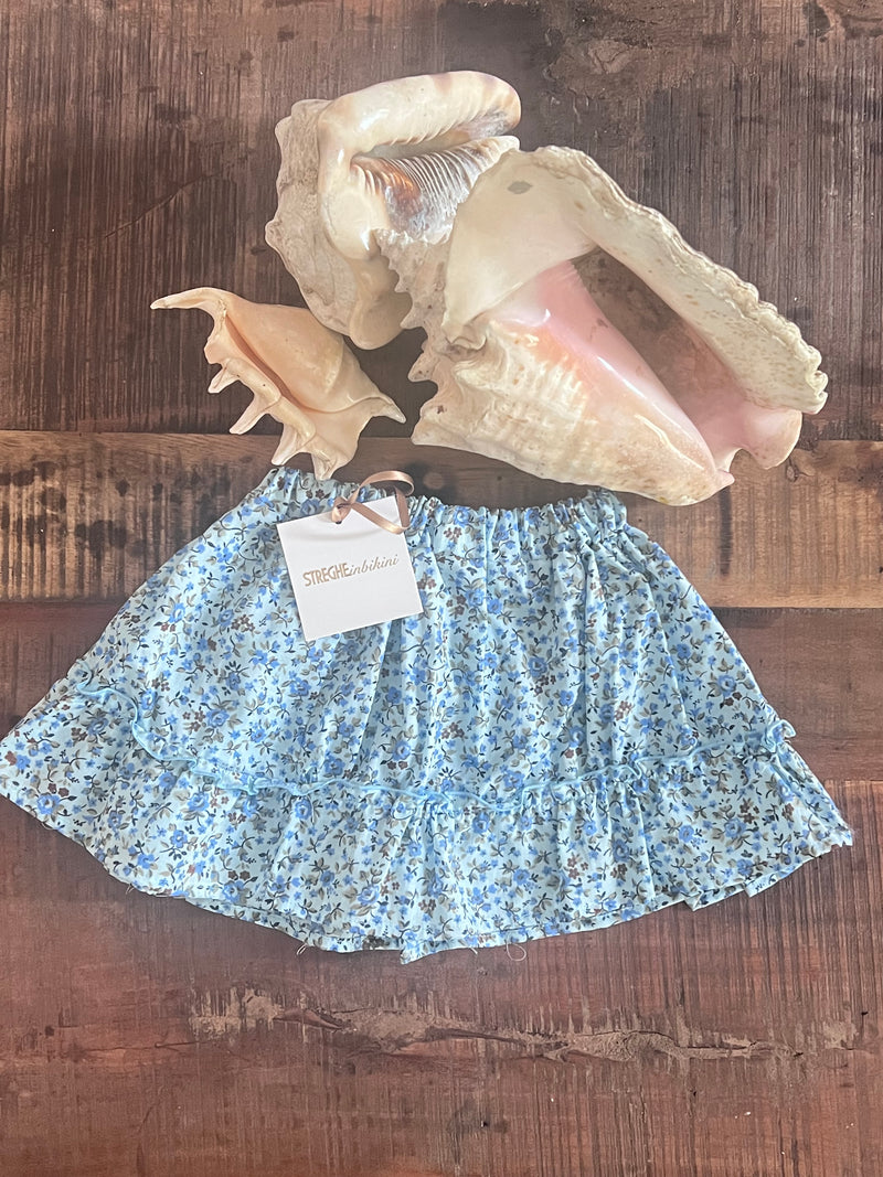 Gonna in cotone fantasia blu Sky abbinata con i costumi della linea in cotone e top. Adatta anche come copricostume. Elastico in vita.
