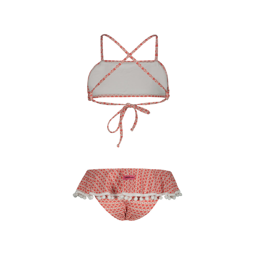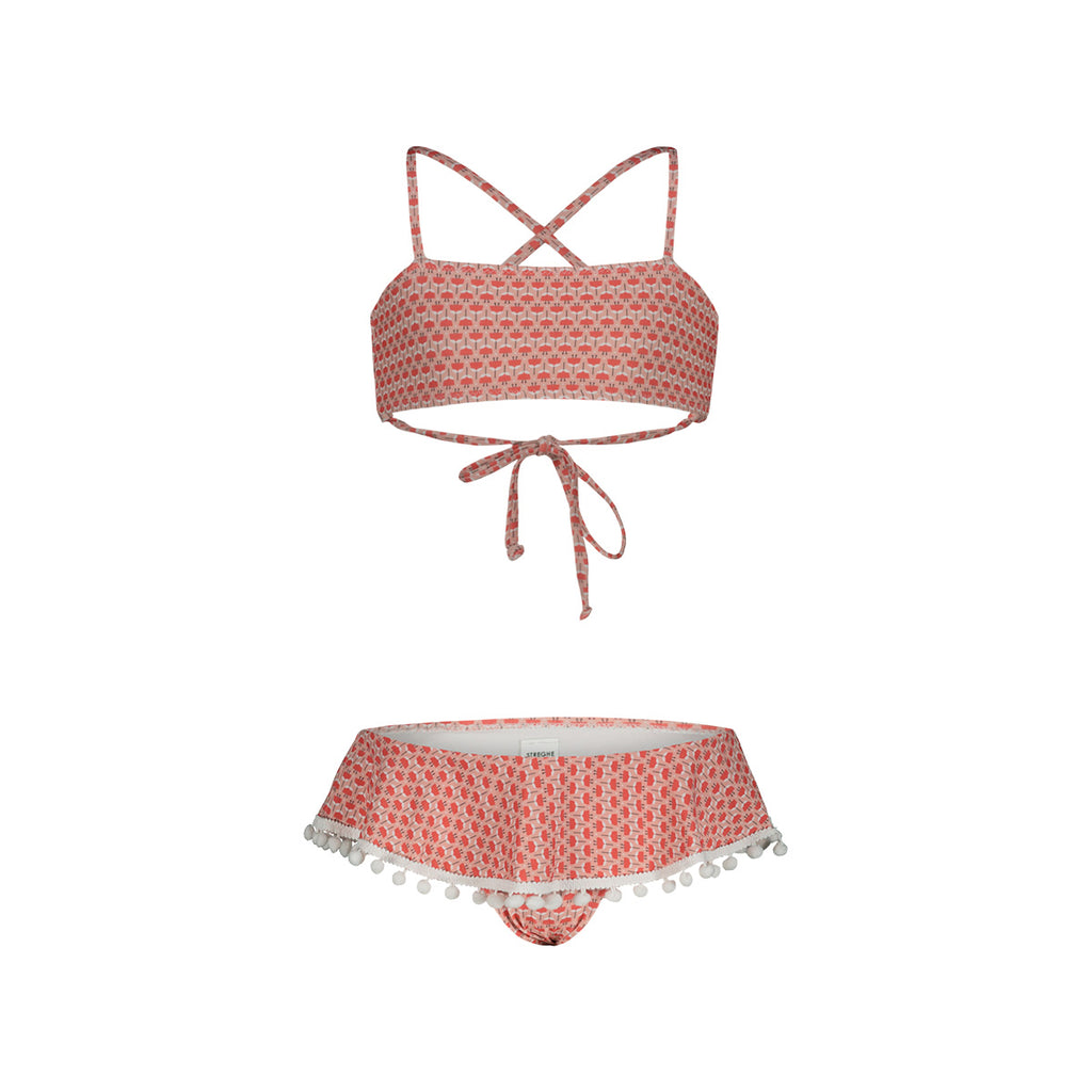 Bikini Elisa in fantasia tulipani in microfibra. fascia con lacci regolabili e slip con balza con pompon.