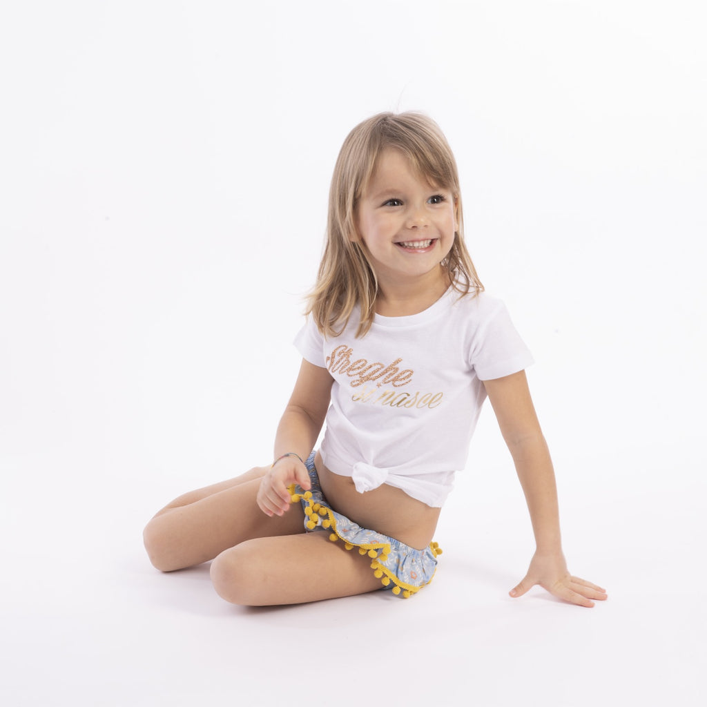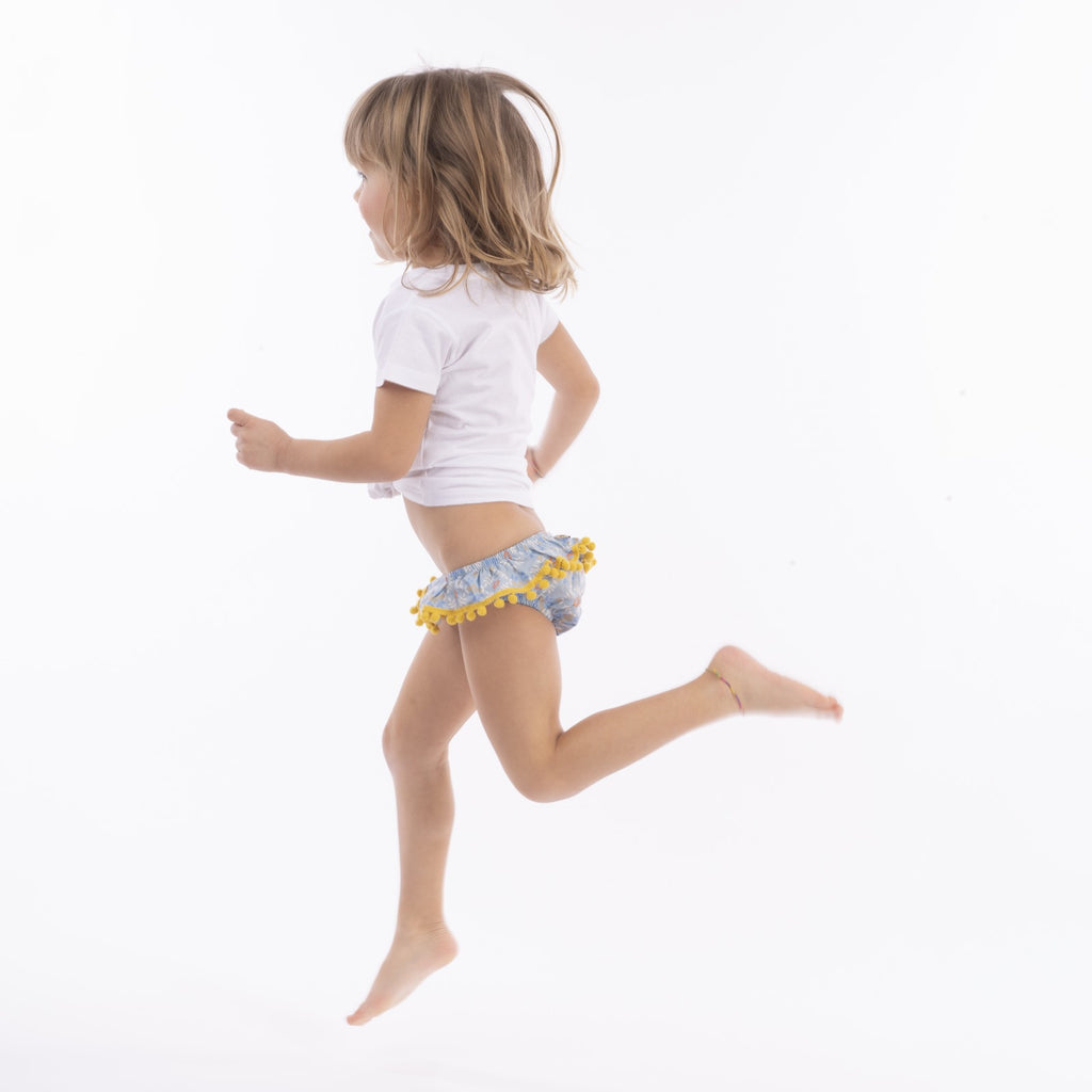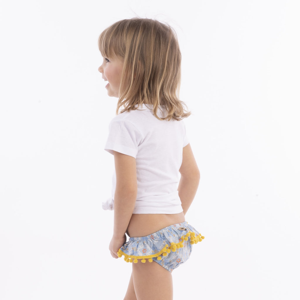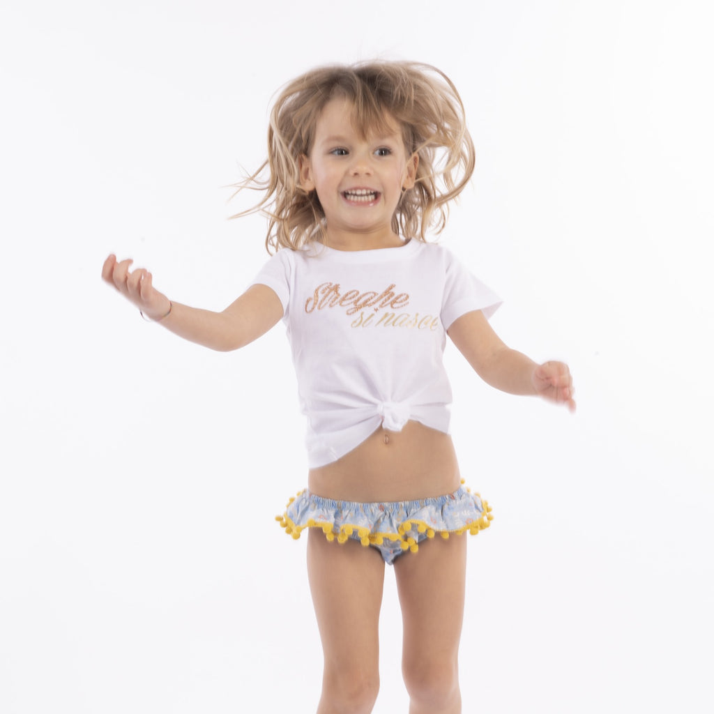 Slip da bagno modello Lavinia in cotone con balza rifinita con pompon.