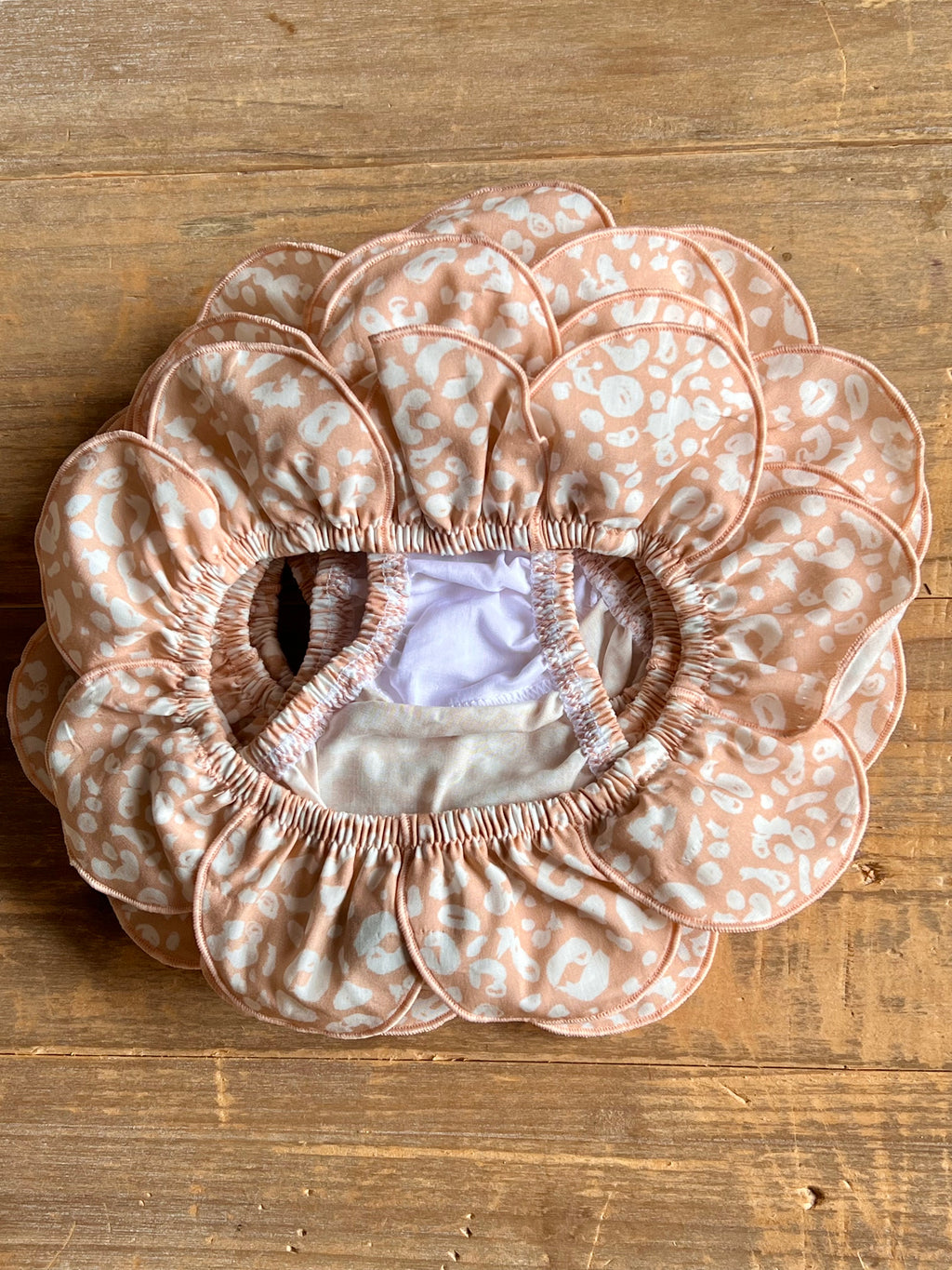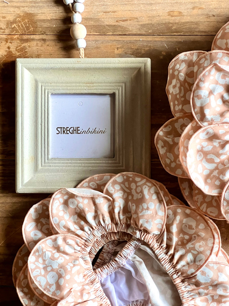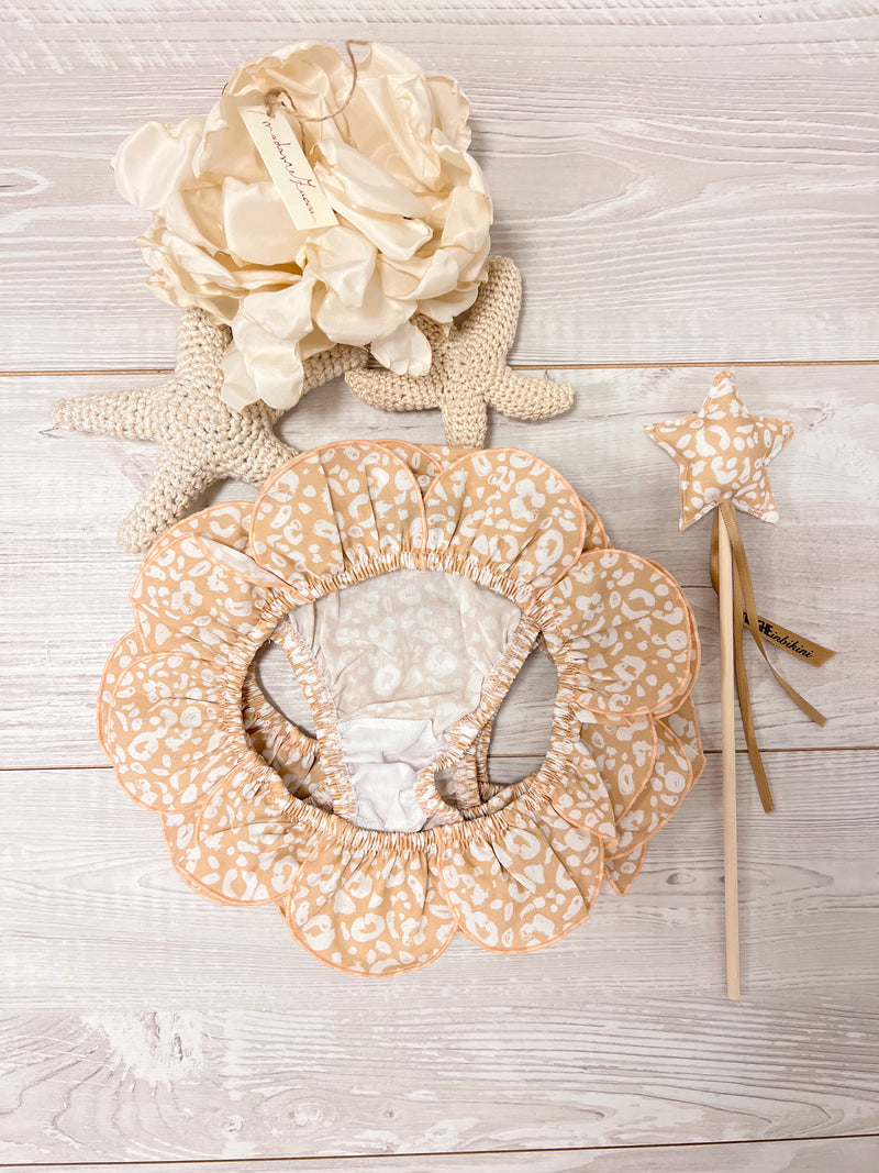 Slip da bagno modello Petalo fantasia Leopard nocciola in cotone organico rifinita con petali.